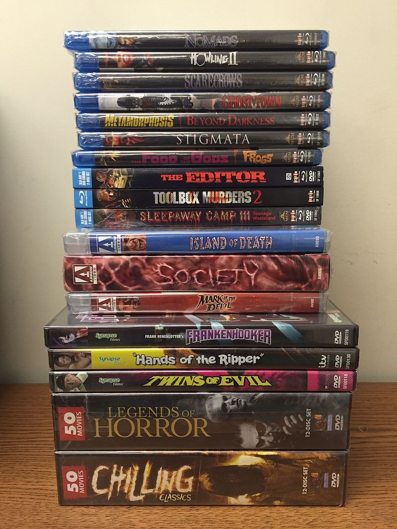 Prize Pack 3: Chilling Classics 50 Movie Pack Legends of Horror 50 Movie Pack Twins of Evil Hands of the Ripper Frankenhooker Mark of the Devil (Combo pack) Society Collector’s Edition (Combo pack) Island of Death (Combo pack) Sleepaway Camp III (Combo pack) Editor (Combo pack) Toolbox Murders 2 (BLU) Food of the Gods/Frogs (BLU) Stigmata (BLU) Metamorphosis/Beyond Darkness (BLU) Ghost Town (BLU) Scarecrows (BLU) Howling II (BLU) Nomads (BLU) Spoiler: