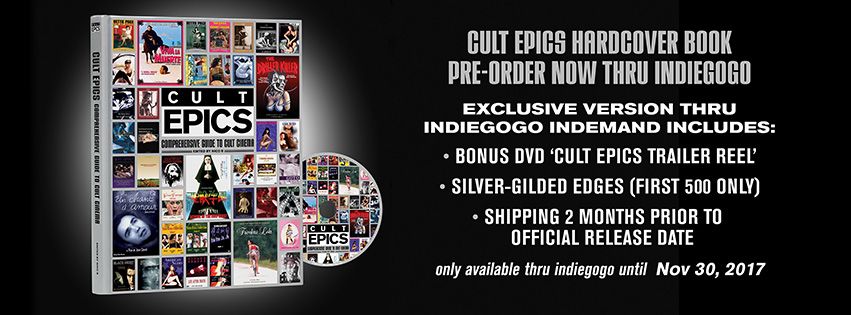 Cult Epics Hardcover book Includes reviews, essays and interviews by Nathaniel Thompson, Mark R. Hasan, Michael Den Boer, Ian Jane, Stephen Thrower, Marcus Stiglegger, Heather Drain and others critics. 256 Pages. Fully Illustrated. Pre-order Exclusive version thru INDIEGOGO INDEMAND which includes DVD Trailer Reel & Silver gilded Edges! (Limited to 500 copies) available until November 30, 2017 and receive it two months prior to official release date. For limited time only and only thru Indiegogo. | S P O N S O R E D B Y |